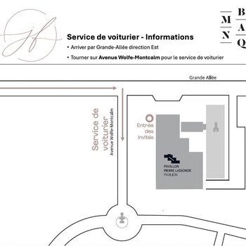 Pour faciliter votre arrivée, un service de voiturier vous sera offert à proximité du Musée National des beaux-arts du Québec, sur l’Avenue Wolfe-Montcalm.